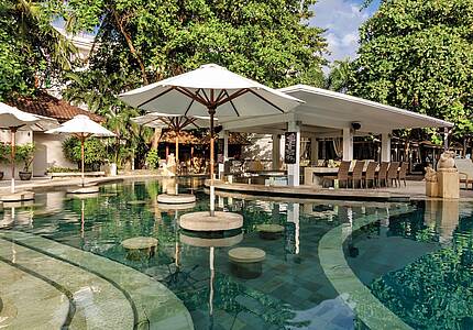 Kostenloses Upgrade auf ein Doppelzimmer Deluxe Sharing Pool (Wert: bis zu € 260,- pro Zimmer / Aufenthalt) oder höher – solange der Vorrat reicht - bei buchung folgender Zimmer - DZ Deluxe Sharing Pool- oder DZ PB. Priv. Liegen -Premium Deluxe DZ private Liegen